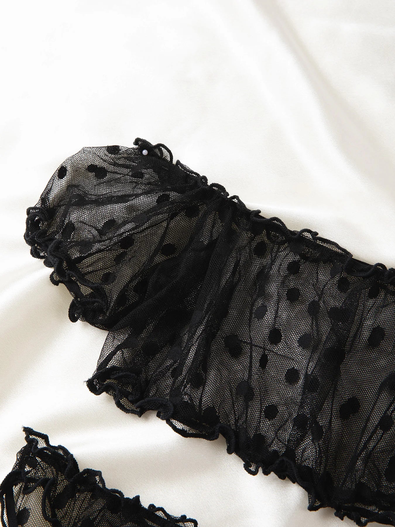 Design: Sheer mesh with delicate embroidered lace and playful polka dot details